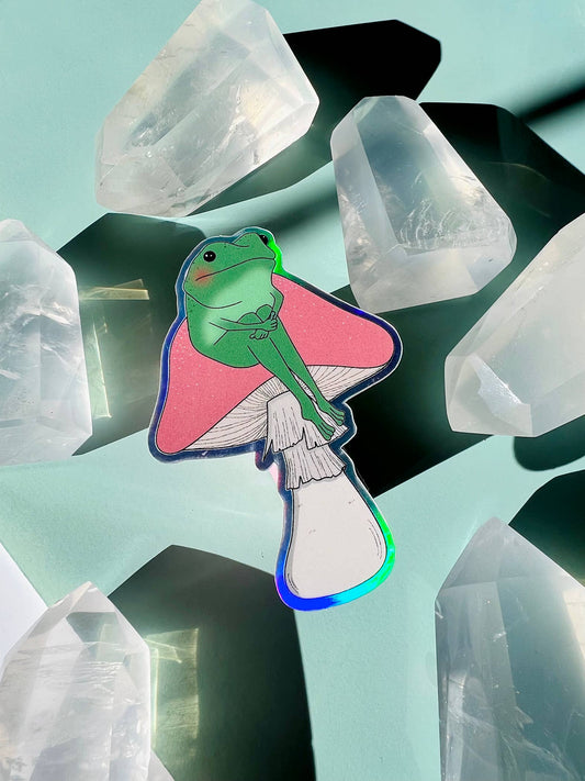 Frog Sitting on a Mushroom Holographic Sticker